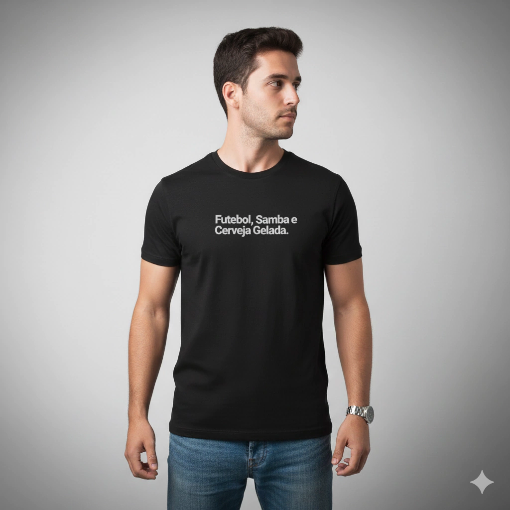 Com seu design toda preta e a frase impactante "FUTEBOL SAMBA E CERVEJA GELADA" estampada na frente, ela é ideal para expressar sua personalidade de forma autêntica e descontraída. Seja para o dia a dia ou para momentos de lazer, essa peça combina versatilidade e atitude.
