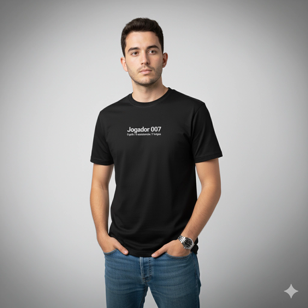 Com seu design toda preta e a frase impactante "JOGADOR 007" estampada na frente, ela é ideal para expressar sua personalidade de forma autêntica e descontraída. Seja para o dia a dia ou para momentos de lazer, essa peça combina versatilidade e atitude.