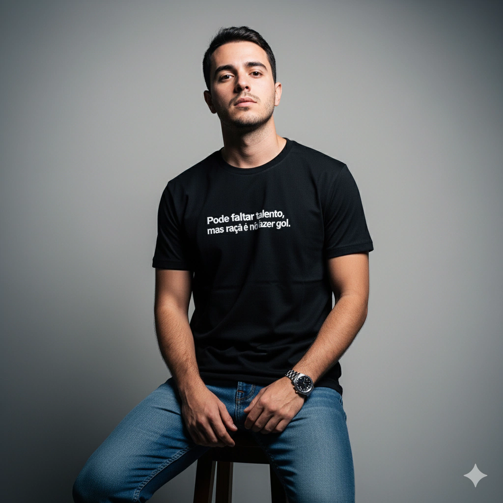 Com seu design toda preta e a frase impactante "PODE FALTAR TALENTO MAIS RAÇA É OBRIGAÇÃO" estampada na frente, ela é ideal para expressar sua personalidade de forma autêntica e descontraída. Seja para o dia a dia ou para momentos de lazer, essa peça combina versatilidade e atitude.